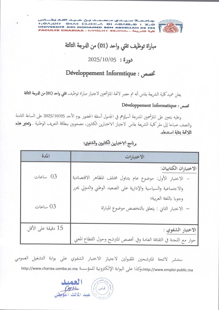مباراة توظيف تقني واحد (01) من الدرجة الثالثة 2025/10/05 : دورة développement informtique : تخصص