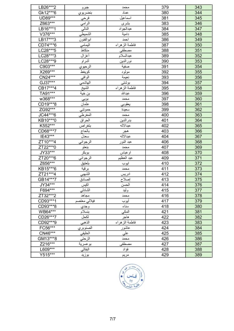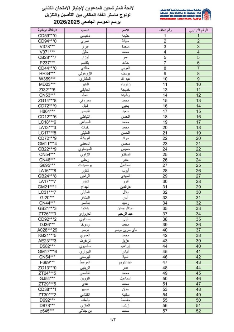 المترشحين المقبولين لاجتياز الامتحان الكتابي لولوج مسلك ماستر " الفقه المالكي بين التأصيل والتنزيل"