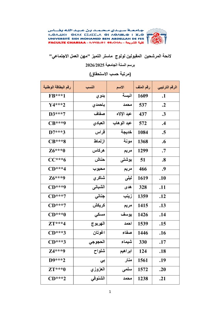 إعلان لفائدة الناجحين بمسلك ماستر التميز " مهن العمل الاجتماعي" للموسم الجامعي 2026/2025